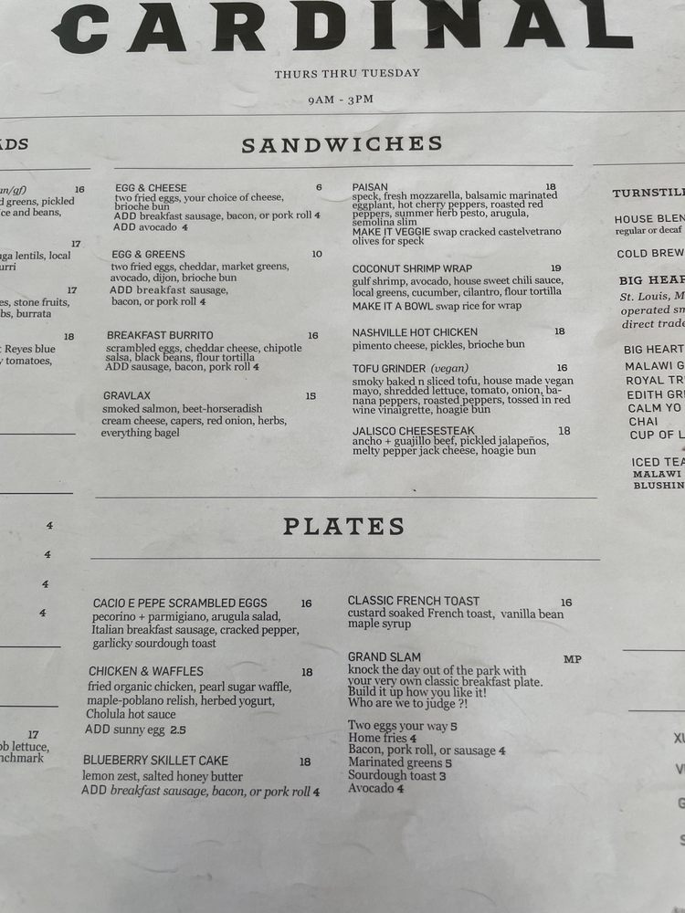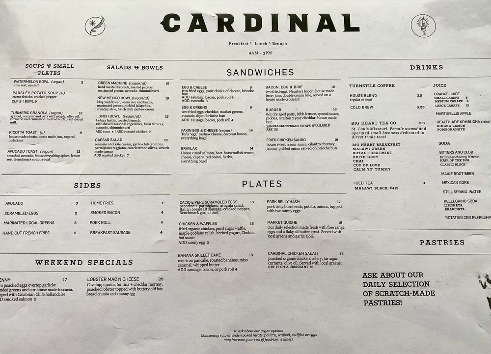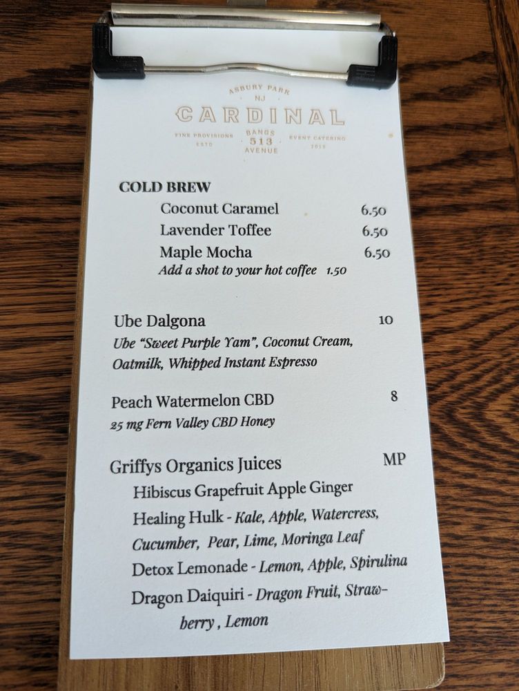 Introducing Cardinal, a cozy restaurant in Asbury Park, NJ, offering a variety of vegan options and unique dishes. From the Fakin' Egg & Cheez sandwich to the Weird Hash plate, their menu is filled with creative and flavorful choices. Customers rave about their delicious drinks like the Ube oatmilk espresso and the house-made sodas. The ambiance is described as "grown-up hipster" with a welcoming staff and prompt service. The outdoor seating area adds to the charm of the place, making it a great spot for brunch or lunch. With gender-neutral restrooms and eco-friendly practices like providing compostable containers and reusable tableware, Cardinal is not only a culinary delight but also a socially conscious dining experience. Experience the vibrant flavors and welcoming atmosphere of Cardinal today.